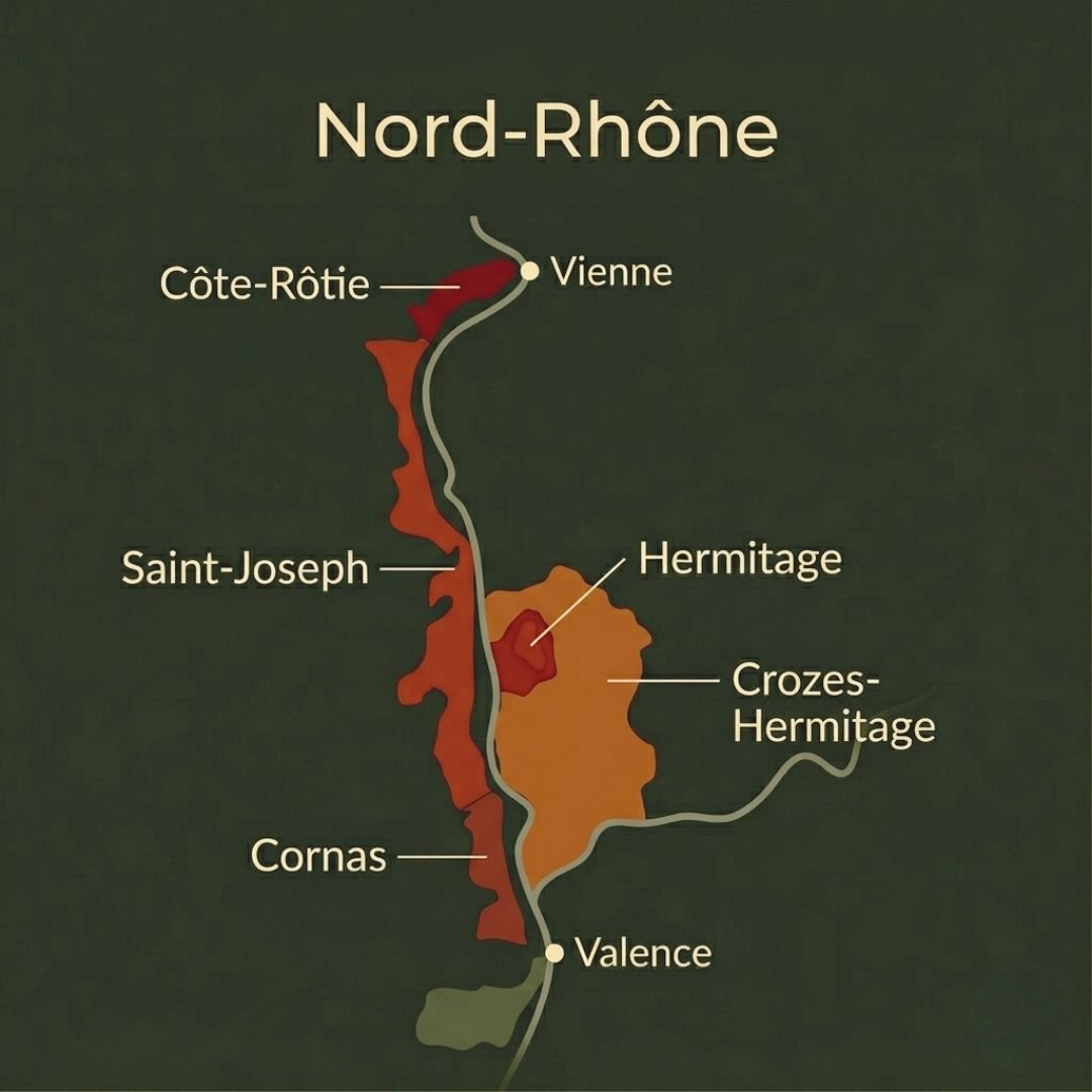 Cornas er det mørke, rustrøde søskenet. Granittskråningene gir vin med enorm tetthet og et nærmest blodmineralt preg. Auguste Clape – nå videreført av sønn Pierre-Marie og barnebarn Olivier – er appellasjonens fremste navn, og beviset på at tradisjonelt håndverk ikke er en nostalgisk hobby, men den beste metoden. Cornas har historisk hatt rykte på seg for å være rustikke og lukkede i ungdommen, men de beste eksemplene er verdt å vente på og flere moderne produsenter slipper tilgjengelige utgaver til svært god pris.
